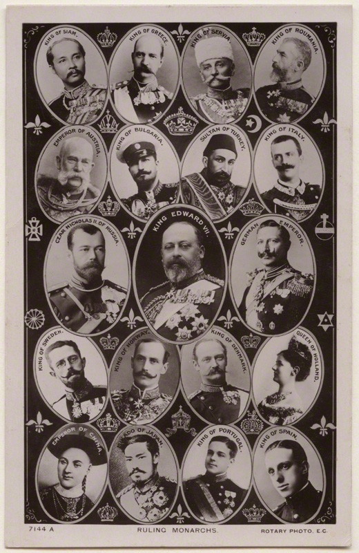 Postcard of ruling monarchs, taken in 1908 between February (accession of King Manuel II of Portugal) and November (death of Guangxu Emperor).