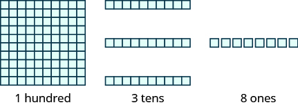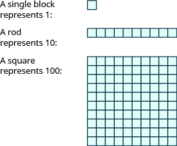 Base-10 blocks provide another way to model place value, as shown in the figure below. The blocks can be used to represent hundreds, tens, and ones. Notice that the tens rod is made up of \(10\) ones, and the hundreds square is made of \(10\) tens, or \(100\) ones.
