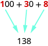 The figure below shows the number \(138\) modeled with \(\text{base}\)-\(10\) blocks.