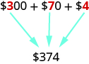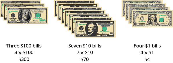 Money gives us a familiar model of place value. Suppose a wallet contains three \($100\) bills, seven \($10\) bills, and four \($1\) bills. The amounts are summarized in the figure below. How much money is in the wallet?