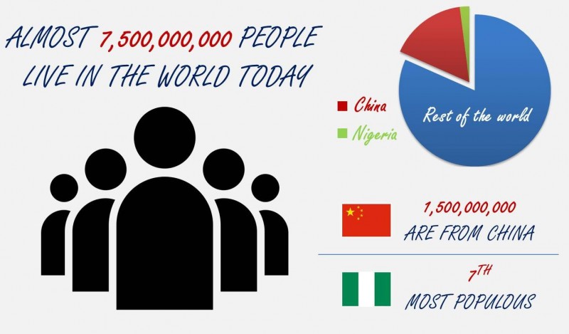 According to the 2016 statistics, there are almost 7.5 billion people in the world. Almost 1.5 billion of us are from China; this is about 20%. Nigeria (see image below) is the 7th largest country by population in the world with a population of about 190 million people.