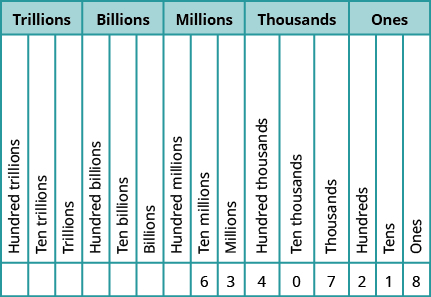By looking at money and base-10 blocks, we saw that each place in a number has a different value. A place value chart is a useful way to summarize this information. The place values are separated into groups of three, called periods. The periods are ones, thousands, millions, billions, trillions, and so on. In a written number, commas separate the periods.
