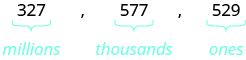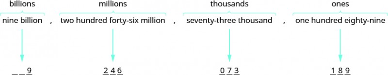 - Draw three blanks to indicate the number of places needed in each period. Separate the periods by commas.