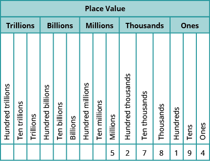 The figure below shows how the number \(5,278,194\) is written in a place value chart.