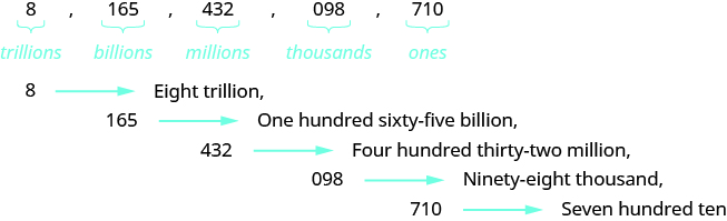 Putting all of the words together, we write \(8,165,432,098,710\) as eight trillion, one hundred sixty-five billion, four hundred thirty-two million, ninety-eight thousand, seven hundred ten.