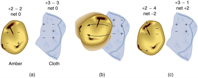 Charges in atoms and molecules can be separated—for example, by rubbing materials together. Some atoms and molecules have a greater affinity for electrons than others and will become negatively charged by close contact in rubbing, leaving the other material positively charged. (See this figure.) Positive charge can similarly be induced by rubbing. Methods other than rubbing can also separate charges. Batteries, for example, use combinations of substances that interact in such a way as to separate charges. Chemical interactions may transfer negative charge from one substance to the other, making one battery terminal negative and leaving the first one positive.