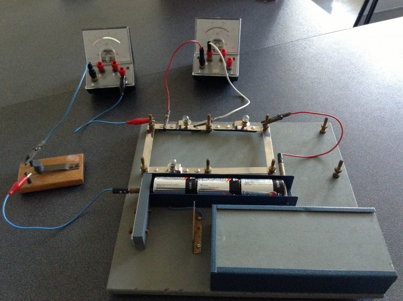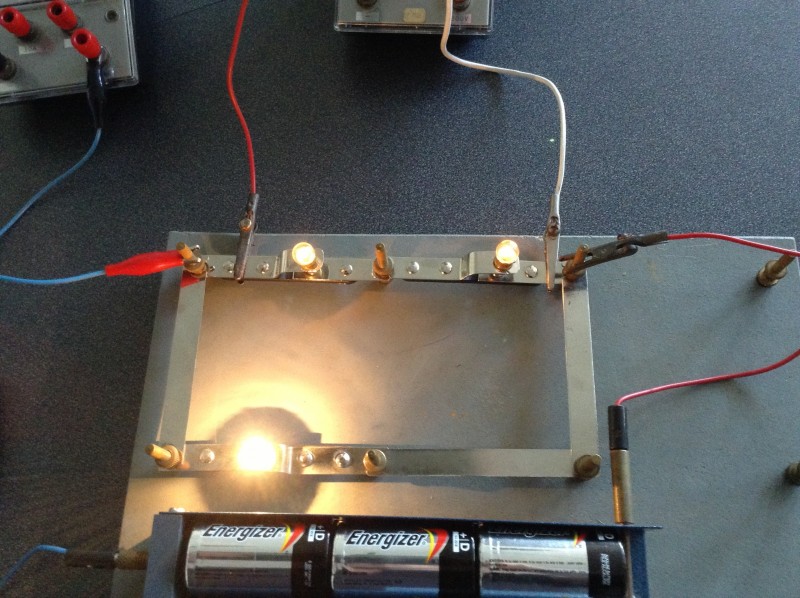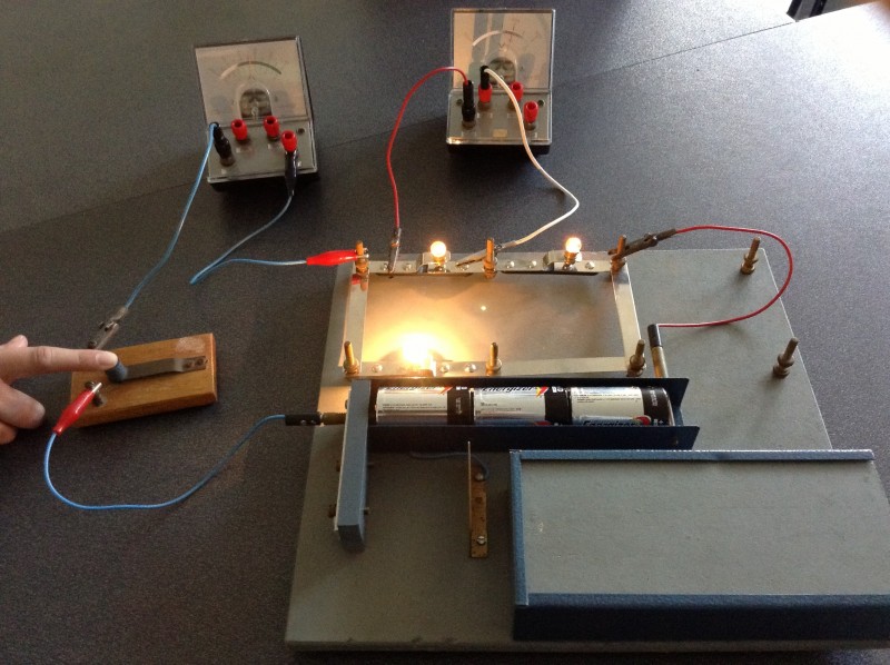 In each branch include an ammeter and a switch. Make notes about what happens when you remove a branch by opening the switch in the branch. What happens to the current in the other branches. Try to predict what will happen before opening or closing a switch and before adding or removing any light bulbs or resistors.