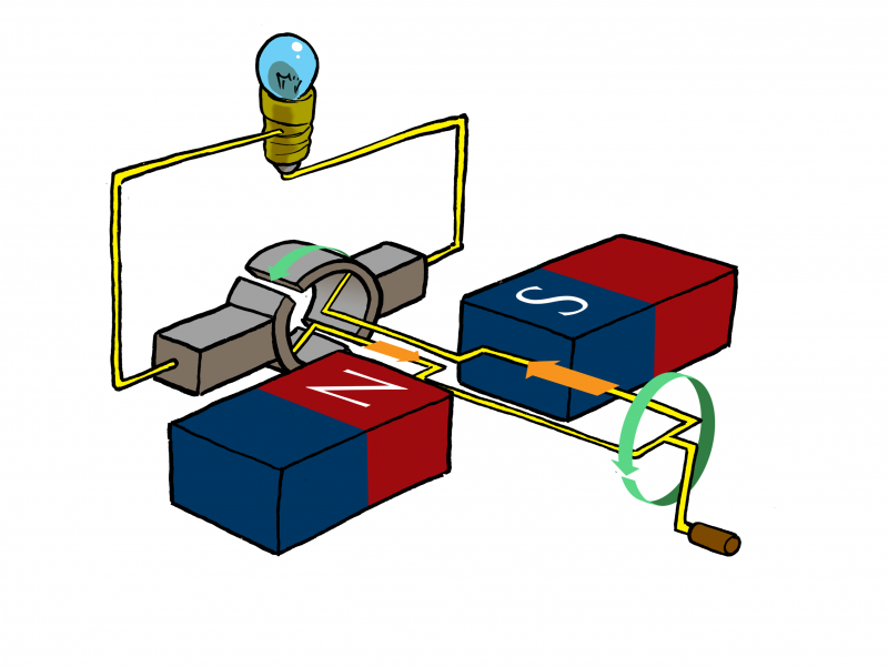 A simple DC generator is constructed the same way as an AC generator except that there is one slip ring which is split into two pieces, called a commutator, so the current in the external circuit does not change direction. The layout of a DC generator is shown in the figure below. The split-ring commutator accommodates for the change in direction of the current in the loop, thus creating direct current (DC) current going through the brushes and out to the circuit. The current in the loop does reverse direction but if you look carefully at the 2D image you will see that the section of the split-ring commutator also changes which side of the circuit it is touching. If the current changes direction at the same time that the commutator swaps sides the external circuit will always have current going in the same direction.