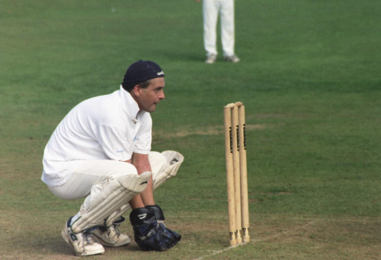 Wicket-keeper in characteristic full squatting position, wearing gloves and facing a delivery from a slow pace or spin bowler. Image credit: Wikimedia Commons, CC BY-SA 3.0