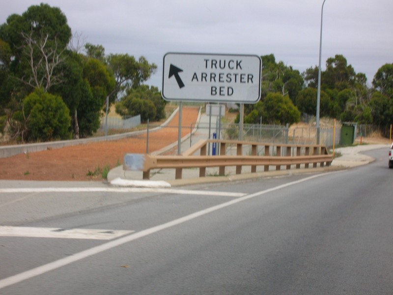 This truck arrestor bed is located on the Great Eastern Highway in Perth, Western Australia. The orange colouration of the gravel is due to the lateritic profile, and common to the area. To the right of the arrester bed is a service road for bed maintenance/truck removal. Safety signage includes "Truck Arrester Bed" to the left and right of the bed, as well as "No Standing in Arrester Bed" (as required by traffic design codes). Image credit: public domain