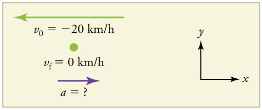 1. Identify the knowns. \(v_0 = -20\text{ km/h},\) \(v_{\text{f}} = 0\text{ km/h},\) \(\Delta t = 10.0\text{ s}.\)