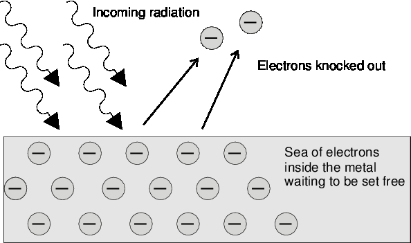 The photoelectric effect: Incoming photons on the left hit the electrons inside the metal surface. The electrons absorb the energy from the photons, and are ejected from the metal surface.