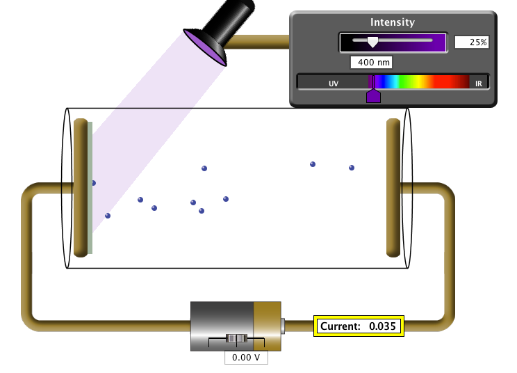 In the diagram, notice that the potential difference supplied by the battery is zero and yet a current is still measured on the ammeter. This is due to the incoming photons having sufficient frequency and hence energy greater than the work function to eject electrons. The ejected electrons travel across the evacuated space and allow for a current to be measured in the circuit.
