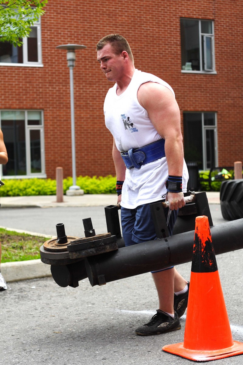 Consider the strongman walking in the figure below. He carries two very heavy sleds as far as he can in a competition. What work is the man doing on the sleds and why?
